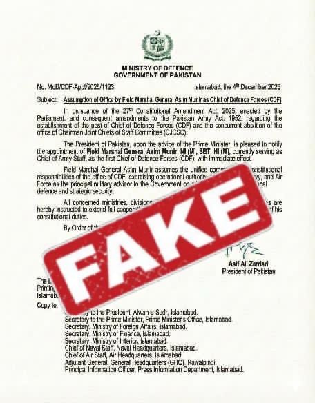 The notification is circulating on social media regarding the assumption of office by Field Marshal General Asim Munir. It is written in the notification that in pursuance of 27th Amendment Act 2025, enacted by parliament, and consequent to the Pakistan Army Act 1952, regarding the establishment of the post of Chief of Defence Forces and the concurrent abolition of the CJCSC.