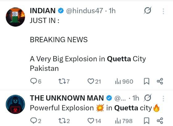 This viral claim regarding the powerful blast in Quetta is totally fabricated and seems to be a part of Indian propaganda against Balochistan and Pakistan because there is no official confirmation or evidence to prove this incident. No authority has reported any explosion in Quetta nor any credible news media. The main goal of such fabricated posts is to spread fear and chaos and that is why it is so important to double check such viral claims and combat such disinformation campaigns responsibly.