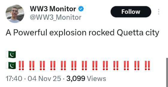 A claim has been made on the social media platform X (formerly known as Twitter) by various account users, including @Bahutblch, @hindus47, @prakharsingh551, and @WW3_Monitor, stating that a blast or explosion occurred in Quetta this morning. According to these users, it was a very powerful explosion that took place in Quetta, resulting in many casualties. However, no further details were mentioned in their posts regarding this alleged blast.